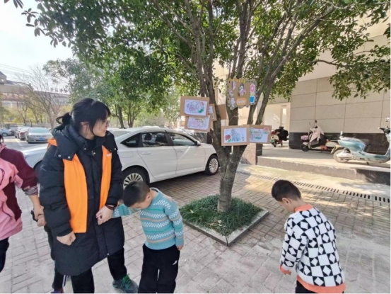 手工课上,志愿者和小朋友剪纸、粘贴、涂鸦填色,共同完成了生动有趣的植物节贺卡;户外活动课上,志愿者陪伴小朋友在绿草坪玩耍,并把植物节贺卡打洞穿绳,挂在树上;游戏活动课上,志愿者和小朋友一起看挖掘机,玩跳圈放球的游戏。