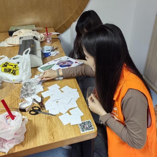 志愿者们分成了三组,在老师的带领下有序地展开了志愿活动。其中一组志愿者留在老师的办公室帮忙制作手工书。裁剪卡片、过塑、装订,志愿者在老师的指导下完美地完成了每一个步骤,为小朋友们制作了一本本有趣的手工书。
