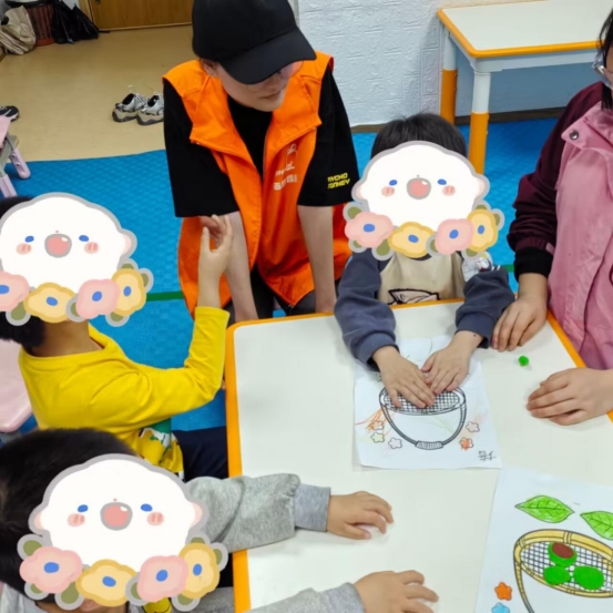另外一组的志愿者进入了大班辅助老师上课,引导小朋友认识点心,拆开包装,小朋友们在老师与志愿者的陪伴下学习得很认真。