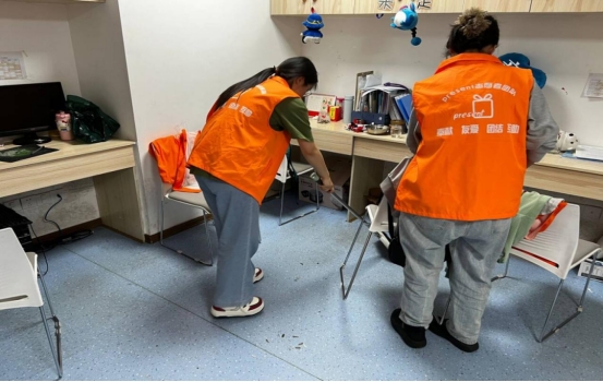 最后一组志愿者负责打扫教室,他们分工合作将各个教室的桌子椅子都进行擦拭消毒处理,最后打扫干净地面,为老师与小朋友提供了一个整洁的学习区域。