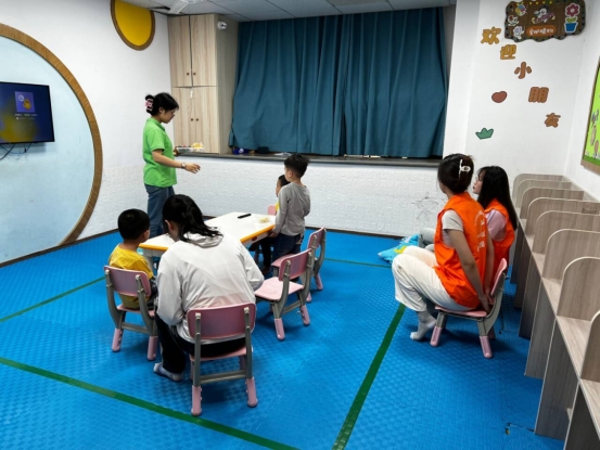 另一组志愿者进入了课堂陪伴小朋友上课,从刚开始的音乐舞蹈课小游戏再到辅助小朋友做手工,剪纸、粘贴、涂鸦填色,志愿者与小朋友都沉浸于其中。课间休息后,老师与志愿者带领小朋友进行了户外活动。