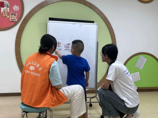 志愿者们准时到达各自岗位,并如常进行着课堂辅教的工作。凭借着几天以来的实践,志愿者们已熟悉了每位小朋友的姓名、年龄等基本信息,大致了解了他们的性格,能够从他们的动作和神态判断他们的心情和想法,进而“因材施教”。然而,这些实践经验还远远不够。小朋友因为离开父母而哭泣、或是突然对任何事物都不愿意做出回应,再或是突然兴奋或难过扰乱课堂秩序等等,这些突发情况都让志愿者们犯了难,不知道该怎么处理。爱弥尔中心的老师们告诉志愿者们:“面对这群孩子要有足够的耐心,并且要坚持,即使他们当下还无法做到独立、无法用语言或行动回应我们的教学,给他们时间,日复一日,他们定会有进步。”