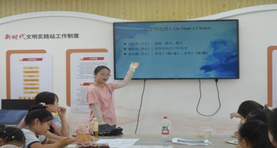 课堂的压轴环节——话剧表演《屈原的选择》,更是将气氛推向高潮。话剧巧妙分为古代组、现代组和旁白组,共两幕。“湘江诗人”一幕,孩子们用纯真的表演重现了屈原投江的悲壮场景,令人动容;“时间旅行救援任务”一幕则充满创意,小朋友们化身现代使者,穿越时空劝说屈原带着希望活下去,展现出对生命的珍视和对英雄的敬仰。此次主题英语课,不仅是一次语言的盛宴,更是一场文化的传承。孩子们在思考中,收获了知识,更在心中种下了传统文化的种子。
