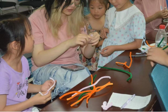 小朋友们和志愿者一起做扭扭棒手工