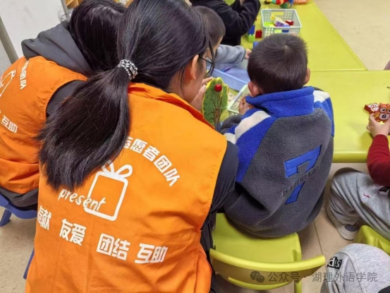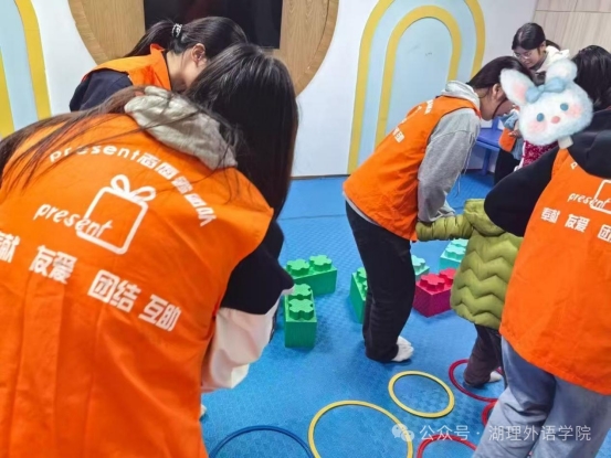 活动现场,志愿者们化身“玩伴”与“陪伴者”:在软垫游戏区,他们俯下身与孩子一同搭起泡沫积木,彩色圆环在笑声中滚动;手工桌前,志愿者们轻握画笔,和孩子一起完成纸张创作;桌面玩具旁,耐心引导的身影与专注摆弄教具的小脑袋凑在一起,勾勒出最柔软的互动画面。从集体游戏到一对一陪伴,橙色背心的身影始终围绕在孩子身边,把公益的温度藏进每一个细节里。