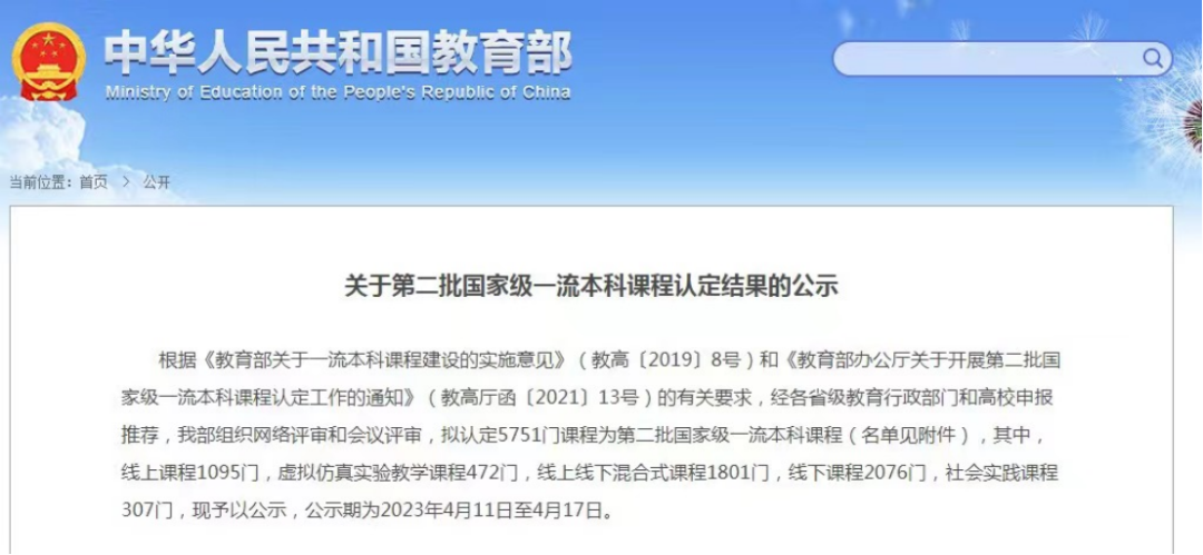 校园网讯 根据《教育部关于一流本科课程建设的实施意见》(教高〔2019〕8号)和《教育部办公厅关于开展第二批国家级一流本科课程认定工作的通知》(教高厅函〔2021〕13号)的有关要求,经各省级教育行政部门和高校申报推荐,我部组织网络评审和会议评审,拟认定5751门课程为第二批国家级一流本科课程(名单见附件),其中,线上课程1095门,虚拟仿真实验教学课程472门,线上线下混合式课程1801门,线下课程2076门,社会实践课程307门。