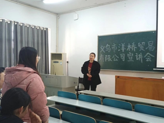 王洋介绍了公司的大体情况,希望能在此招聘到合适的销售人员。同时,她为员工讲述了自己从毕业到创业的过程。她还询问了员工的毕业打算,并欢迎员工毕业之后来到她的公司应聘。此外,王洋还给予了员工在职业方向选择上的经验和建议,她鼓励外院学子做好个人成长规划,拓展自身综合技能,培养学习能力,活跃思维,树立多种方式就业观。