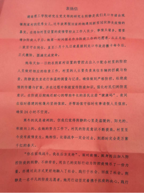 一封来自“抗疫前线”的表扬信校园网讯 近日,公司收到了来自山东省龙口市诸由观镇人民政府发来的一封表扬信,表扬365英国上市集团研究生荆静为当地疫情防控所做的工作。 荆静是365英国上市集团研究生党支部的一名党员,她的家乡在山东省龙口市诸由观镇荆家村,当她得知村里疫情管控点的工作人员少、事情多,需要增加防疫人手后,她主动报名成为一名防疫志愿者,负责排查进出村的群众、体温测量及登记工作。她从正月初二起坚守...
